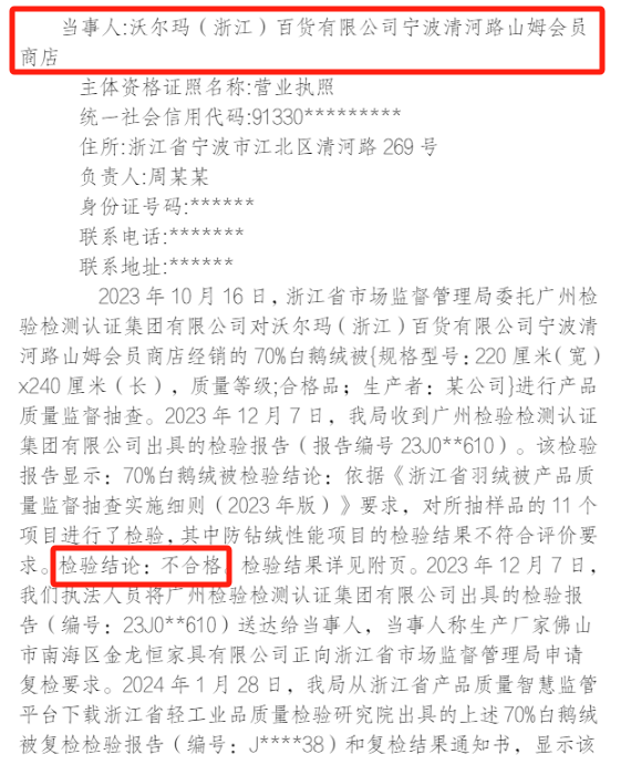 据国家市场监督管理总局官网发布的公告,今年5月,沃尔玛(浙江)百货有限公司宁波清河路山姆会员商店因销售的白鹅绒被抽检不合格被宁波市江北区市监局作出行政处罚。