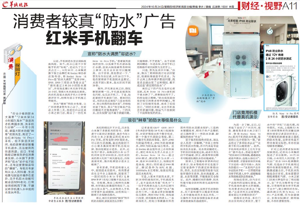 导读:“行业少有的防水大满贯”“2米水深24小时超久泡水”“放进洗衣机高强水流,洗手机5分钟”……今年9月底,被强大防水功能“种草”的贺先生,购买了一台红米Note 14 Pro+手机。但不到四天时间,他的新鲜感却随着手机进水、无法使用而快速消退。近日,羊城晚报记者收到多位消费者反映,小米旗下多款声称“防水”的手机不防水,还有过度营销误导的“嫌疑”。有相关专家和从业人员科普,生活场景与实验环境存在差异,